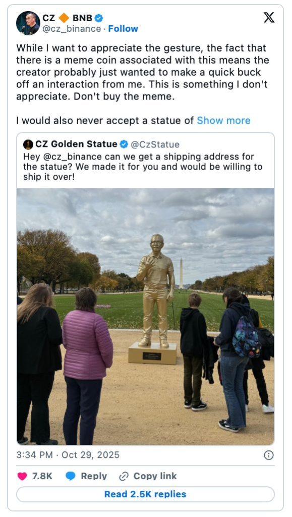 Das jüngste Beispiel ist CZSTATUE, ein Token, der zu Ehren einer realen, 14 Fuß hohen goldenen Statue eingeführt wurde, die zu Ehren von CZ in Washington, D.C., errichtet wird. Obwohl CZ ausdrücklich davor warnte, den Token zu kaufen, stieg er innerhalb weniger Stunden von einer Marktkapitalisierung von $300.000 auf über $9 Millionen, was einem 30-fachen Sprung entspricht..