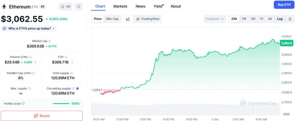 ETH konnte gestern bereits einen deutlichen Kursanstieg verzeichnen. ETH ist jetzt wieder $3.057 wert. Das ist ein Kurszuwachs von 8,85% innerhalb der letzten 24 Stunden. Die Anleger wollen wieder Ethereum kaufen, weil sich die Ausgangslage für Risikokapital mit dem Ende der Quantitativen Straffung durch die Fed geändert hat.