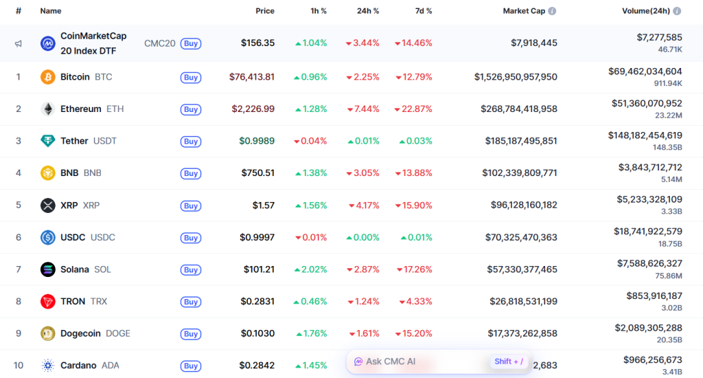 Ein Blick auf die Zahlen der Top-10-Kryptos zeigt, dass sich die Kurse tiefrot gefärbt haben. Der Absturz, der letzte Woche seinen Anfang nahm, und sich nach der Nominierung von Kewin Warsh zum neuen Fed-Vorsitzenden beschleunigte, trifft alle Beteiligten der Branche.