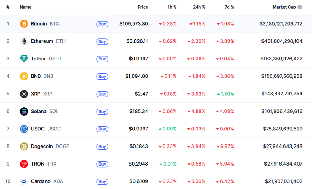 Am Donnerstag verloren die Coins weiter an Wert, dieser Trend verstärkt sich aktuell. Bitcoin rutschte mit einem Verlust von 1% seit gestern unter die $110.000-Marke. Ethereum gab weitere 2,16% nach und liegt mit $3.831 weiter deutlich unter der $4.000-Marke.