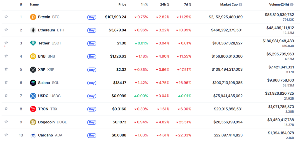 Die letzte Äußerung von Trump ließ die Kryptokurse neuerlich abstürzen. Bitcoin rutschte unter die $110.000-Marke und notiert aktuell bei nur noch $108.127. Das ist ein Verlust von 2,72%, die Kursrückgänge summieren sich für die letzte Woche auf mittlerweile 11,10%.