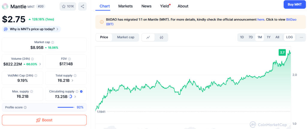 Damit hat sich Mantle in der Liste der größten Kryptowährungen nach Marktkapitalisierung auf Platz 20 vorgearbeitet. Der Siegeszug von Mantle begann jedoch schon deutlich früher. Noch im Juli dieses Jahres war Mantle lediglich $0,567 wert, mittlerweile ist der Coin um $2,77 zu haben.