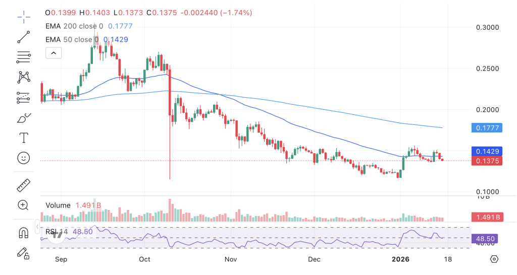 Auch wenn Dogecoin bereits stark in das Jahr gestartet ist, bleibt die Chartsituation weiterhin schwierig. Der Kurs konnte zwar kurzfristig über den EMA50 steigen, der als wichtiger gleitender Durchschnitt in der technischen Analyse gilt, allerdings war der Ausbruch nicht nachhaltig.
