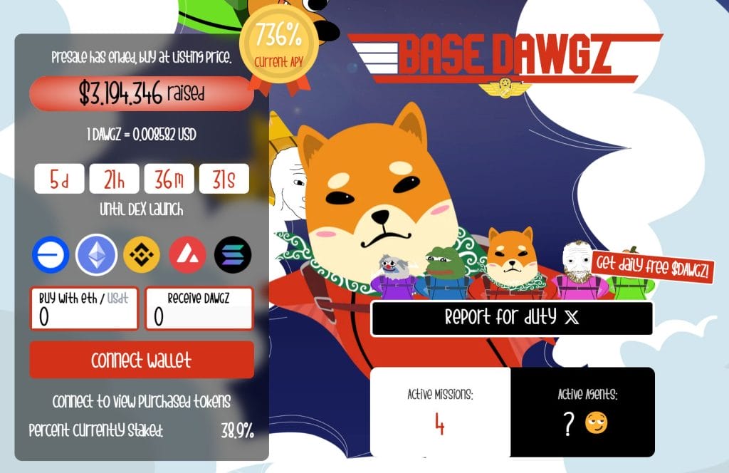DOGS ist nach seinem Launch am 26. August 2024 durchgestartet. Ähnlich könnte es mit dem neuen Meme Coin Base Dawgz ($DAWGZ) werden. Aktuell befindet sich der Coin mit seinem Top-Gun-Shiba-Inu-Thema im Presale. Das bedeutet, dass er noch nicht auf den Krypto-Börsen verfügbar ist. Interessierte Anleger können den Coin jedoch bereits jetzt über die offizielle Website kaufen, bevor DAWGS nächste Woche auf dezentralen Börsen eingeführt wird.