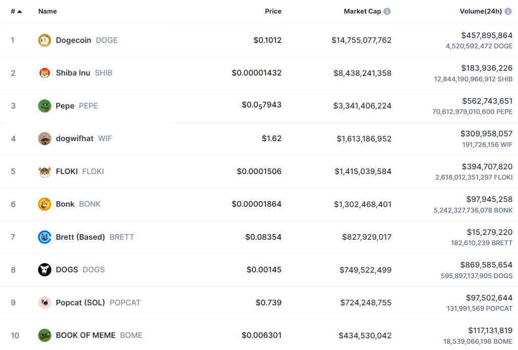 Top 10 der Meme Coins nach Marktkapitalisierung