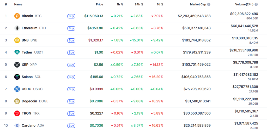 Bitcoin liegt gegenüber gestern um 2,58% im Plus, Ethereum um 8,29% und XRP um 7,24%. Den wildesten Ritt hat BNB hingelegt. Mit einem Gewinn von 14,23% innerhalb von 24 Stunden liegt BNB im Wochenvergleich sogar um 9,23 Prozent vorn und hat die $1.300-Grenze wieder erfolgreich geknackt.