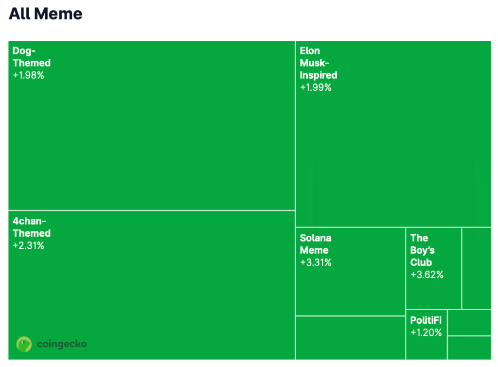 Wie bereits erwähnt, sind Meme-Coins in den letzten 24 Stunden gestiegen, wobei die Token durchweg im grünen Bereich lagen. Murad-Picks führten die Aufwärtsbewegung mit einem Plus von 3,8 % im gleichen Zeitraum an, dicht gefolgt von Token mit Frosch-Motiven, die um 3,7 % zulegten.