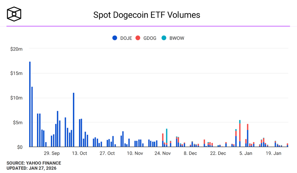 Hätten die ETFs jedoch mit größerer Intensität gehandelt, hätte der Aufwärtstrend weitaus explosiver ausfallen können. TDOG verzeichnet derzeit ein durchschnittliches Tagesvolumen von nur 1.600, während die übrigen DOGE-bezogenen ETFs mit einem Gesamtvolumen von nur 693.000 US-Dollar am Montag weiterhin verhalten sind.