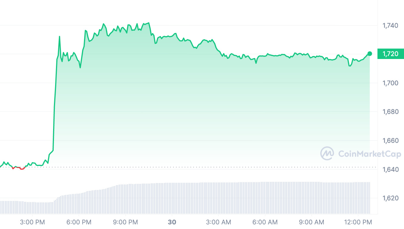 Ethereum übertrifft 1.700 Dollar nach Wal-Transaktion