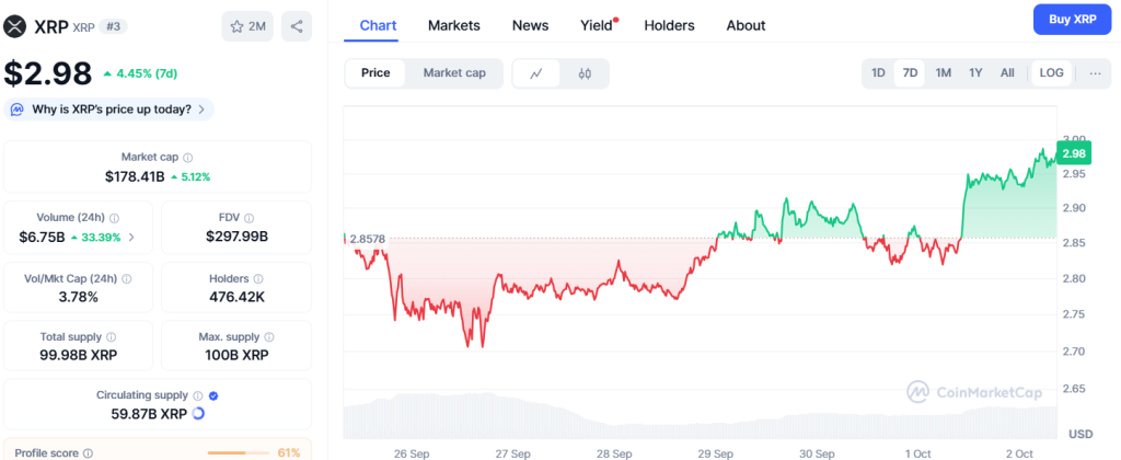Der Kryptomarkt hat gestern auf grün gedreht und hält weiterhin Kurs. XRP konnte seit gestern um 4,66% zulegen, im Wochenvergleich sind es 4,17%. Damit steht XRP kurz vor der psychologisch wichtigen $3-Marke.
