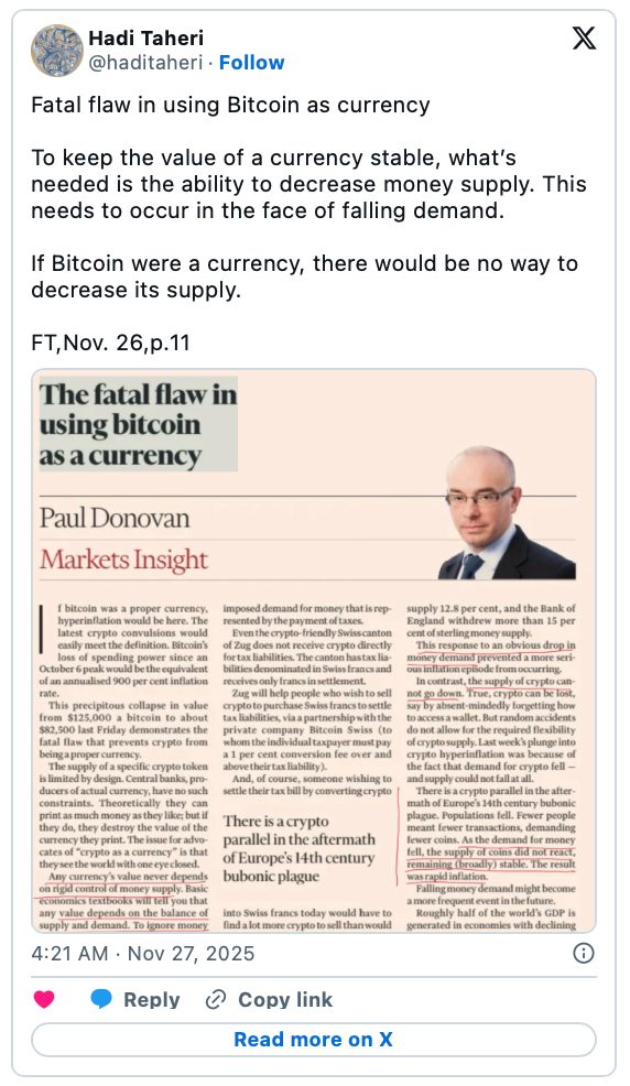 Nachdem der Bitcoin von seinen Höchstständen im Oktober bis in den Bereich von 80.000 Dollar gefallen war, wurde er erneut von traditionellen Finanzkommentatoren unter die Lupe genommen, die argumentierten, dass der Vermögenswert nicht als Währung funktionieren kann.