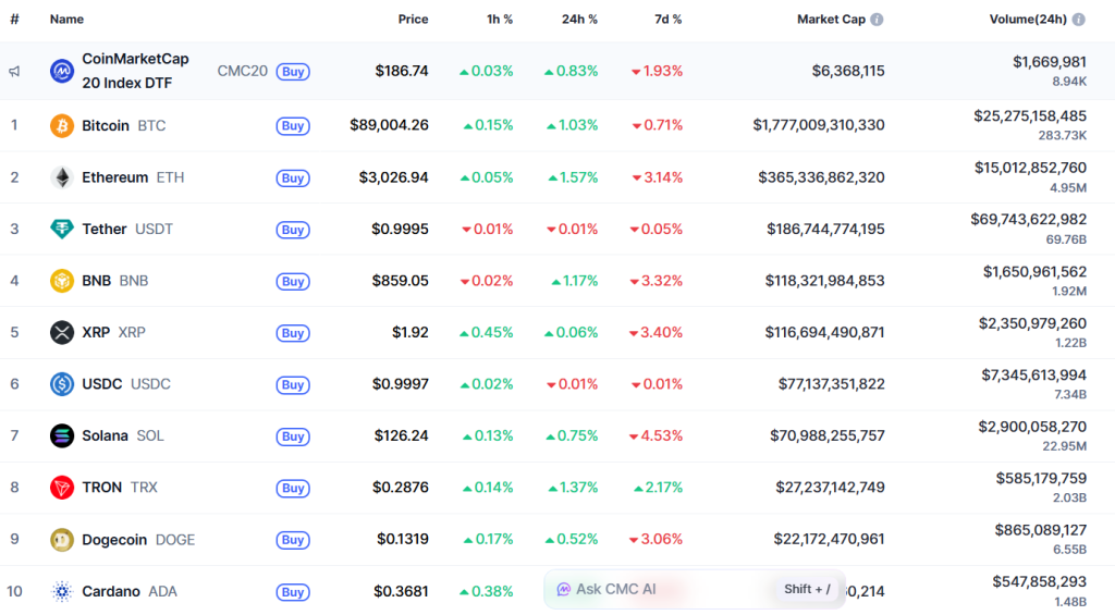 Der Coinmarktetcap Index zeigt aktuell einen Kursgewinn von 0,82% für die letzten 24 Stunden. Bitcoin konnte seit gestern um 1% zulegen und steht bei $89.003. Das ist allerdings immer noch ein leichter Wochenverlust von 0,73%.