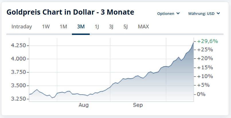 In den frühen Morgenstunden des Freitags erreichte Gold auf den COMEX Dezember-Futures-Märkten ein neues Allzeithoch bei 4.371 US-Dollar. Innerhalb von nur sieben Tagen verteuerte sich das Edelmetall um 7,7 Prozent, getrieben von geopolitischen Spannungen, Handelszöllen und wachsender Skepsis gegenüber dem US-Dollar.