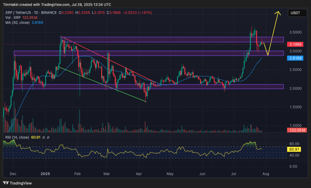 Die Prognose folgt der robusten Performance von XRP in diesem Jahr. Der Token erreichte am 18. Juli ein neues Rekordhoch von $3,65 und übertraf damit sein bisheriges 2018er-Hoch von $3,40. XRP hat in den letzten zwei Wochen um 9 % und im letzten Monat um 47 % zugelegt und damit sowohl Bitcoin als auch die anderen in diesem Bericht aufgeführten Altcoins übertroffen.