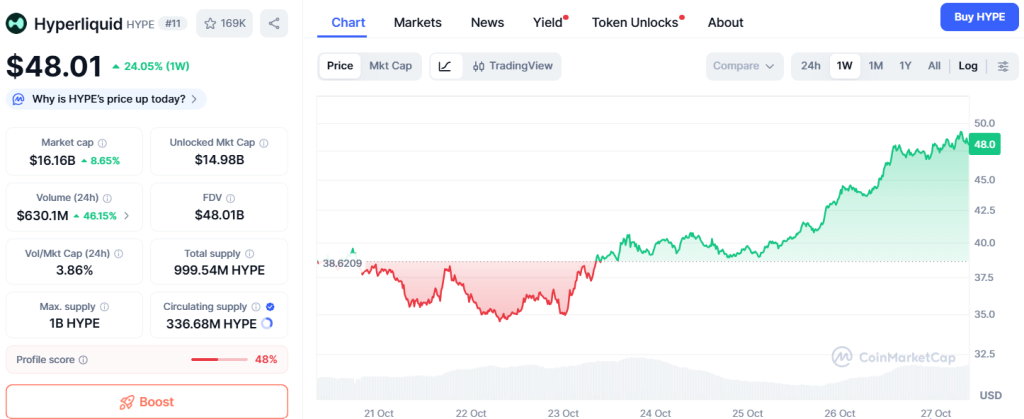 So können sich die Hyperliquid-Investoren über Kursgewinne von nahezu 25% freuen. Allein seit gestern legte die Kryptowährung um rund 9% zu. Damit lässt Hyperliquid seine Mitbewerber deutlich hinter sich und festigt seine Stellung als Nr. 11 der Welt.