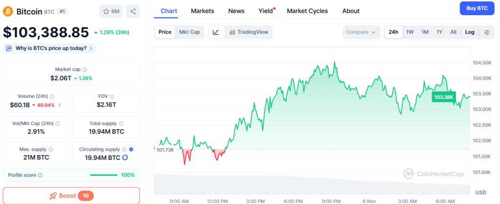 Nach seinem Tiefststand von $99.600 kletterte BTC wieder auf bis zu $104.526. Aktuell hält sich Bitcoin bei $103.388. Die Analysten zeigen sich angesichts der leichten Erholung unsicher, ob es sich dabei um einen neuen Aufschwung oder doch nur um einen vorübergehenden Kursanstieg handelt.