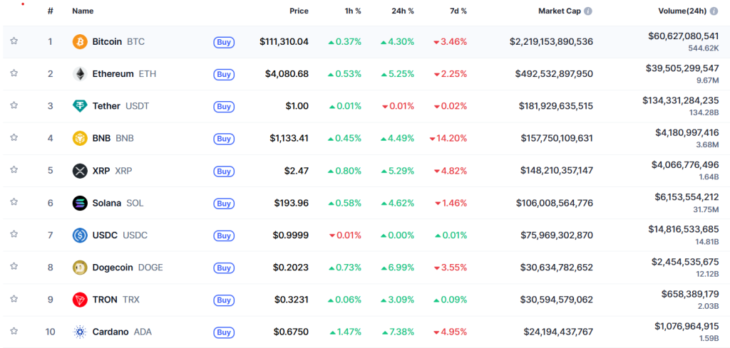 Dieser Optimismus schlägt sich seit gestern in durchwegs steigenden Kursen nieder. So stieg Bitcoin seit gestern um 4,28% und kletterte damit auf einen Wert von $111.236. Ethereum legte 5,07% zu und ist jetzt wieder $4.077 wert.