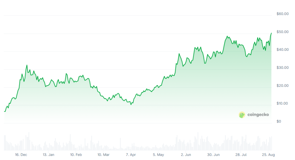 Am Mittwochmorgen notiert Hyperliquid (HYPE) bei 50,60 US-Dollar – ein Kursniveau, das den jüngsten Trend des Altcoins eindrucksvoll unterstreicht. Während sich viele Kryptowährungen derzeit unterhalb ihrer lokalen Höchststände bewegen, hat sich HYPE in den vergangenen Monaten deutlich nach oben gearbeitet. Seit dem 7. April, als der Coin bei 10,27 Dollar gehandelt wurde, ergibt sich ein Kurszuwachs von rund 393 Prozent. Innerhalb von nur fünf Monaten konnte der Altcoin damit eine bemerkenswerte Wertsteigerung erzielen.