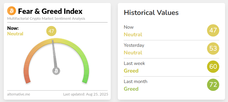 Die aktuelle Unsicherheit spiegelt sich auch in den Stimmungsindikatoren wider. Der Bitcoin Fear and Greed Index liegt aktuell bei 47 Punkten und signalisiert damit eine neutrale Marktverfassung mit leicht pessimistischer Tendenz. Deutlich positiver zeigt sich hingegen der vergleichbare Sentiment-Index von CNN für den US-Aktienmarkt, der bei 61 notiert – ein deutlich optimistischeres Niveau. Diese Differenz verdeutlicht, dass sich die Risikoaversion im Krypto-Sektor zuletzt verschärft hat.
