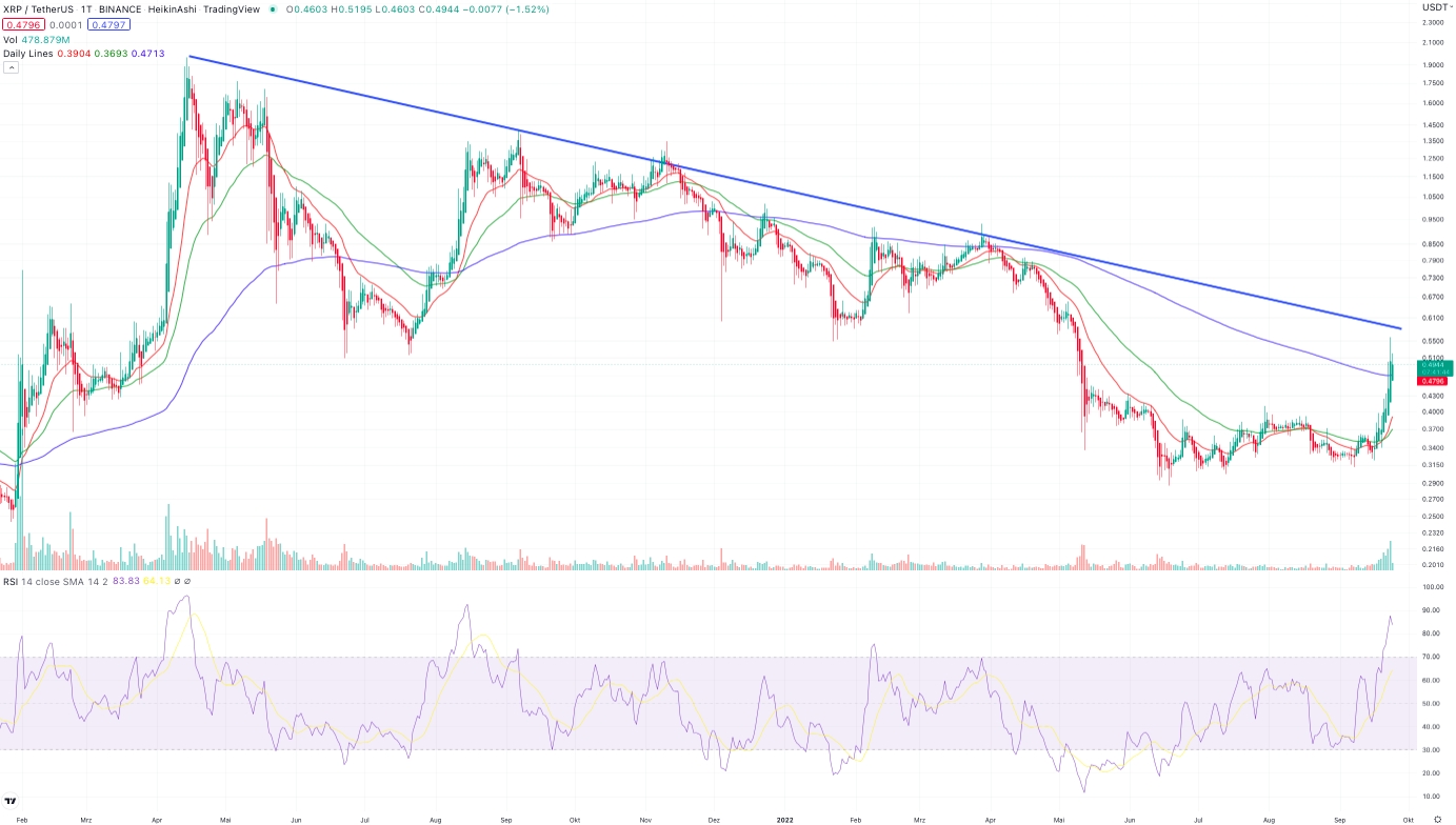 Aktuell steht XRX im Fokus der Krypto-Community. Der Kampf gegen XRP wird als Handeln gegen alle Kryptos aufgefasst. Die SEC brachte einen Großteil der Krypto-Community gegen sich auf. Krypto-Fans verfolgen indessen genau die neusten Entwicklungen und handeln XRP vorwiegend fundamental. Der positive Newsflow könnte auch in der kommenden Woche anhalten und XRP nachhaltig über 0,50 USD treiben.