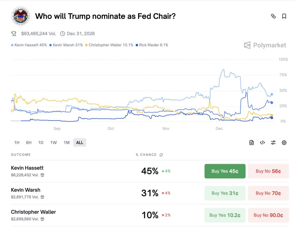 Die aktuellen Daten von Polymarket geben einen klaren Einblick in die Erwartungen zur nächsten Besetzung des Fed-Vorsitzes. Mit rund 45 Prozent liegt Kevin Hassett derzeit deutlich in Führung. Der enge Trump-Vertraute wird von Marktteilnehmern als wahrscheinlichster Kandidat eingeschätzt, was seine starke politische Nähe zum Präsidenten widerspiegelt. Auf Platz zwei folgt Kevin Warsh mit etwa 31 Prozent. Deutlich abgeschlagen liegt Christopher Waller bei rund 10 Prozent.