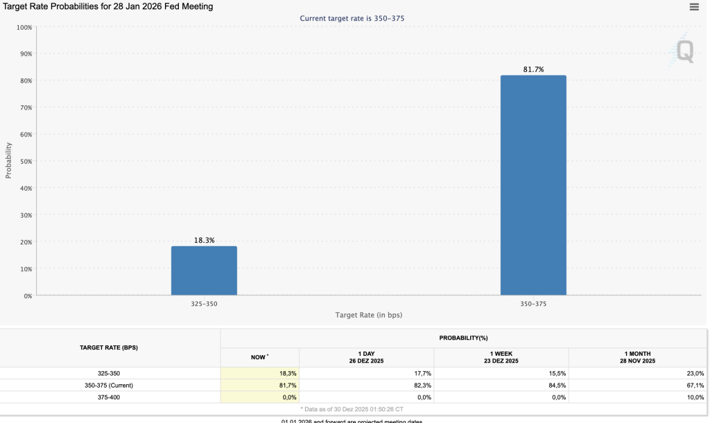 Der aktuelle Federal Reserve-Leitzins liegt derzeit in einer Spanne von 3,50 bis 3,75 Prozent. Der nächste geldpolitische Zinsentscheid der Fed wird in rund einem Monat erwartet und steht damit erneut im Fokus der Finanzmärkte. Nach aktueller Bewertung des Markts rechnen Investoren mit einer rund 80-prozentigen Wahrscheinlichkeit damit, dass die Notenbank eine Zinspause einlegt und das derzeitige Niveau beibehält. Etwa 20 Prozent der Marktteilnehmer halten hingegen eine weitere Zinssenkung um 25 Basispunkte für möglich.