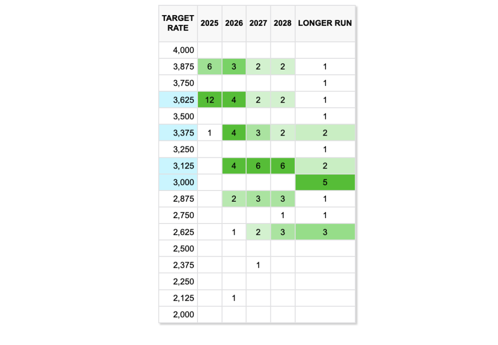 Der aktuelle Dot Plot der Federal Reserve signalisiert für 2026 keine aggressive Lockerung, sondern vielmehr nur 1 bis maximal 2 Zinssenkungen um jeweils 25 Basispunkte gegenüber dem heutigen Niveau.