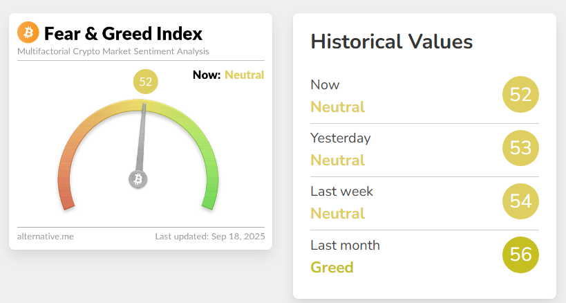 Der Kryptomarkt zeigt sich derzeit mit starkem Momentum, doch Euphorie ist nicht zu spüren. Im Gegenteil: Viele Anleger bleiben vorsichtig, obwohl Bitcoin wieder bei rund 117.165 Dollar notiert und Ethereum sich der Marke von 4.600 Dollar nähert. Ein Blick auf den Fear and Greed Index von alternative.me unterstreicht diese Stimmungslage. Der Index, der die Marktstimmung auf einer Skala von 0 bis 100 misst, notiert aktuell bei 52 und damit genau im neutralen Bereich. Extreme Angst beginnt bei Werten unter 25, extreme Gier bei Werten über 75. Mit 52 zeigt sich also weder Panik noch Euphorie, sondern eine abwartende Grundhaltung.