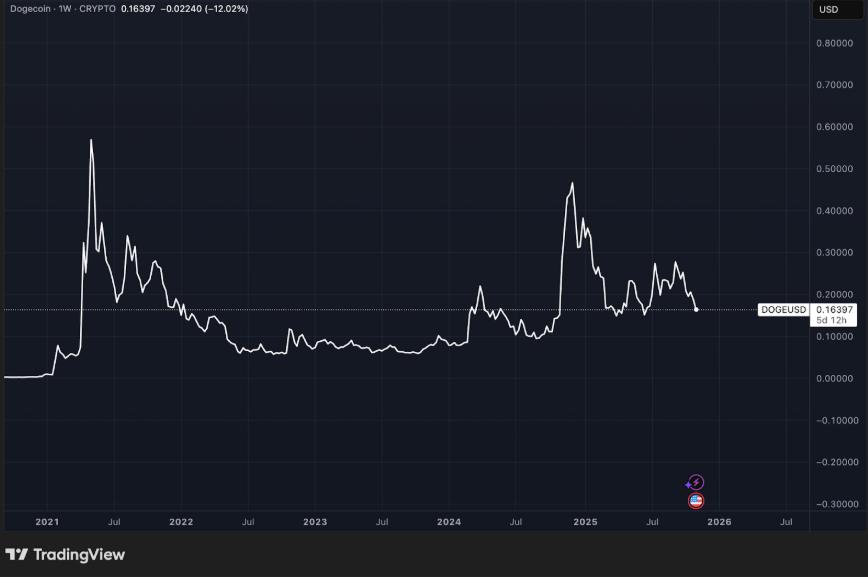 Doch anstatt abzuheben, fiel DOGE in den letzten 24 Stunden um 4,7% und liegt nun im letzten Monat 36,1% im Minus, während der breitere Kryptomarkt ins Wanken geriet. Bitcoin rutschte sogar noch tiefer als bei seinem Flash-Crash vom 17. Oktober und liegt nun knapp unter $103.000.