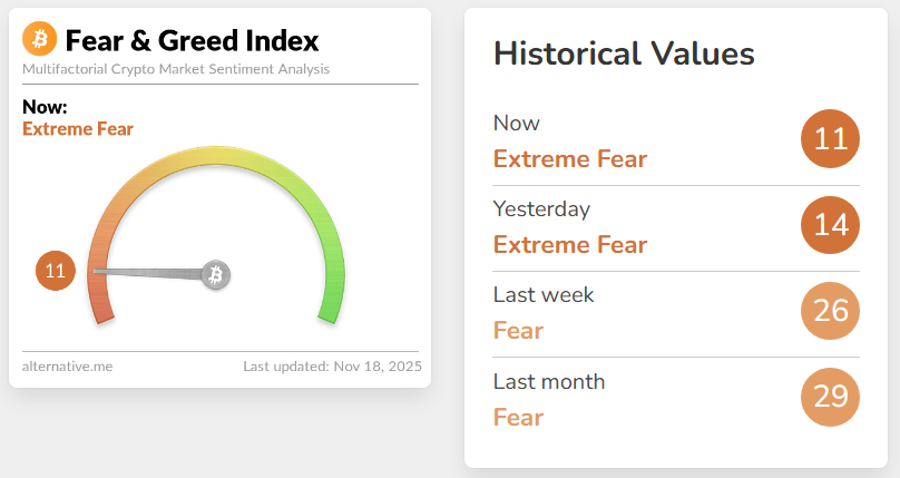 Der Kryptomarkt kennt auch am Dienstagmorgen nur eine Richtung: nach unten. Der Bitcoin Kurs notiert aktuell bei 89.758 US-Dollar, und hat auf 24-Stunden-Sicht 5,8 Prozent an Wert eingebüßt. Bei zahlreichen Altcoins fallen die Verluste sogar noch drastischer aus. Der Fear & Greed Index von alternative.me indes, der die Stimmung auf dem Markt widerspiegelt, notiert indes auf einem Zählerstand von nur 11 – der Wert steht für “extreme Furcht” unter den Krypto-Anlegern.