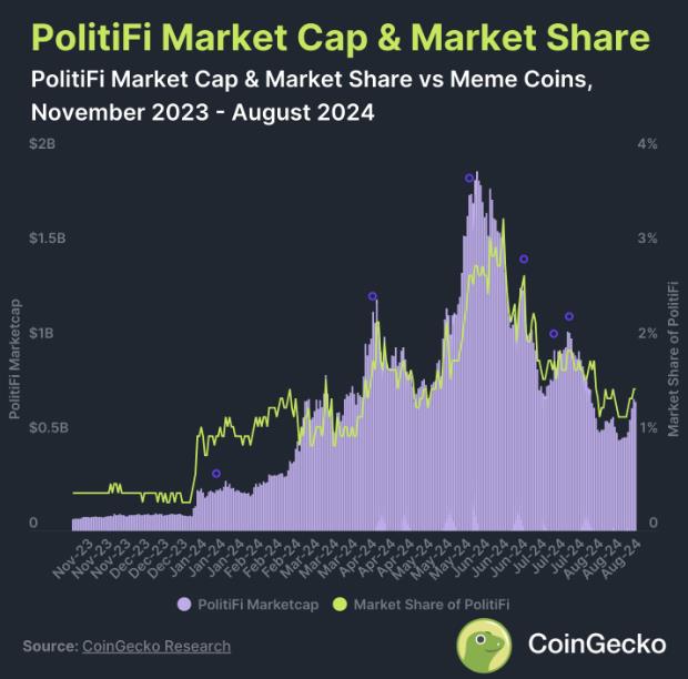 Einem Bericht von CoinGecko vom 27. August zufolge sind politisch motivierte Token oder „PolitiFi“-Coins in diesem Jahr um 782 % gestiegen und haben damit sogar den gesamten Meme-Coin-Markt übertroffen.