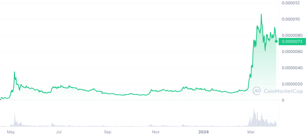 Tatsächlich scheinen die Märkte voll von entsprechenden Memecoins zu sein, viele sind bereits um tausende Prozent gestiegen. Darunter etwa cat in a dogs world (MEW, +158%), Book of Meme (BOME, +1.757% Anstieg), Bonk (BONK, +3.478%), Degen (DEGEN, +153%) oder Rekord-Meme-Coin Pepe Coin (PEPE) mit seinem Kurs-Plus von mehr als 12.600%.