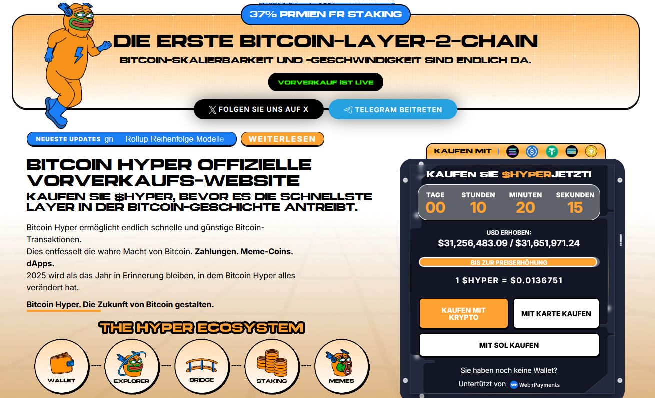 Die Bitcoin-Blockchain erhält ihre erste Layer-2 Lösung und das sorgt am Markt für mächtige Furore. Bitcoin Hyper ist der native Token des Krypto-Presales, der im Vorverkauf bereits über 31.25 Millionen US-Dollar gesammelt hat. Bitcoin Hyper ist eine vollständige Blockchain-Technologie, die von Grund auf neu entwickelt wurde. Ihr Ziel ist einzig und alleine, die Bitcoin-Blockchain zu skalieren und ihre Effizienz zu steigern. Auch die Gebühren sinke mit der Technologie von BTC Hyper.