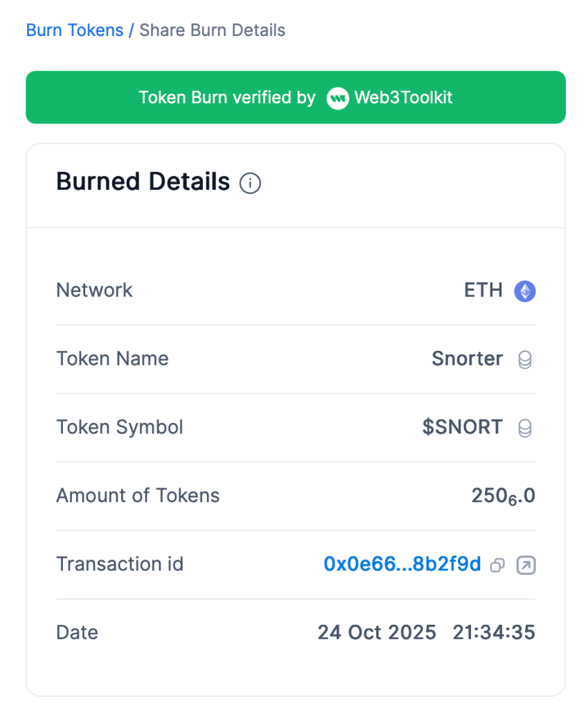 Am 24. Oktober zündete der Snorter Bot die Lunte mit einem 250 Millionen Token Burn und löschte damit die Hälfte des gesamten Angebots für immer aus der Blockchain. Von 500 Millionen auf 250 Millionen, wurde SNORT sofort doppelt so knapp und für viele doppelt so interessant.
