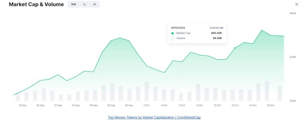 Die Meme Coins befinden sich auf einem Höhenflug und haben den Höchststand der Marktkapitalisierung vom 29. September von 53 Milliarden Dollar überschritten und liegen derzeit bei 54,1 Milliarden Dollar.