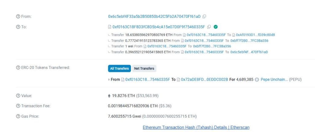 Am Montag tauschte ein anderer Wal ETH im Wert von 53.563 $ gegen 4,6 Millionen $PEPU Token.