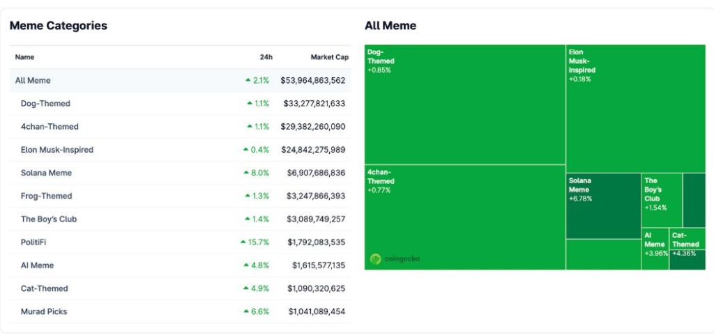 Wie bereits erwähnt, sind die Meme-Coins über Nacht um 2,1 % gestiegen, was vor allem auf die Rallye der Meme-Coins von PolitiFi zurückzuführen ist.