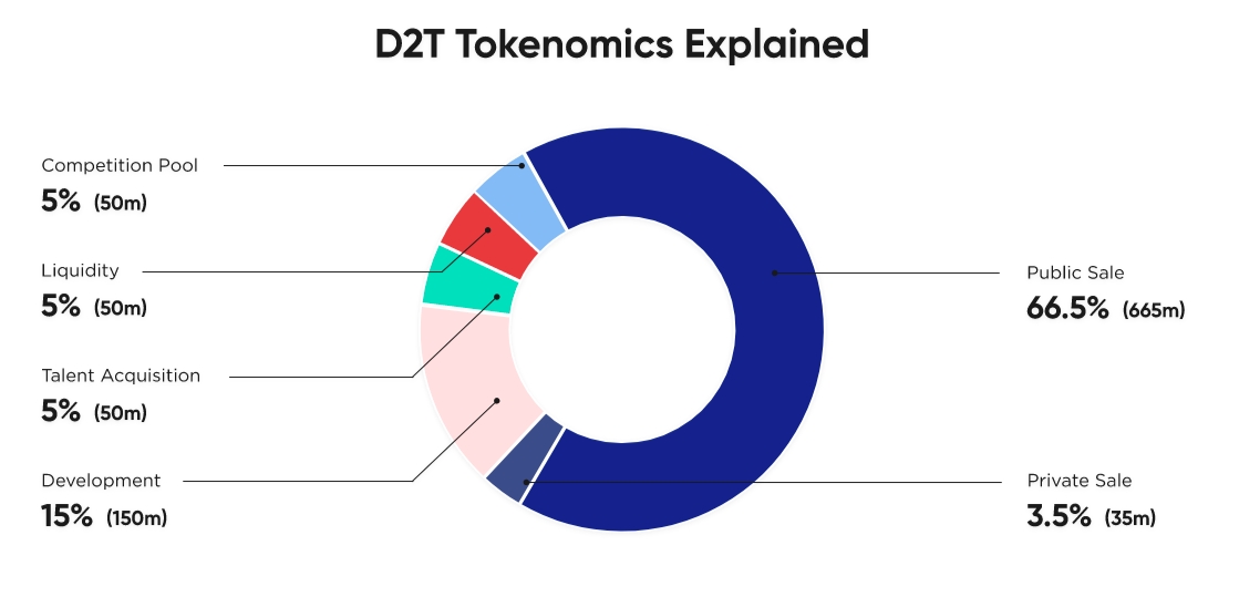 Der Total Supply des ERC-20-Token D2T ist auf eine Milliarde Stück gedeckelt. 70 % des Total Supplys werden über die neun Presale-Phasen hinweg verkauft.