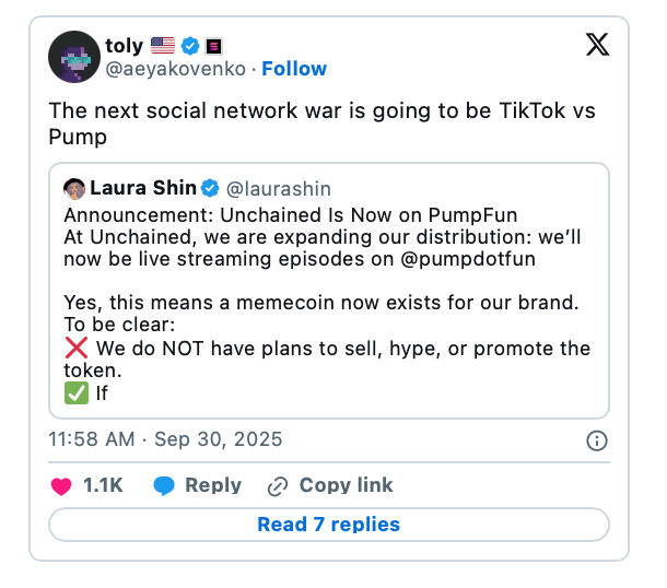Der Kommentar des Solana-Gründers Anatoly Yakovenko, dass Pump.fun durch eine Livestreaming-Funktion mit TikTok konkurrieren könnte, könnte eine Schlüsselrolle bei der Rallye von PUMP gespielt haben.