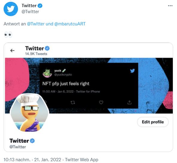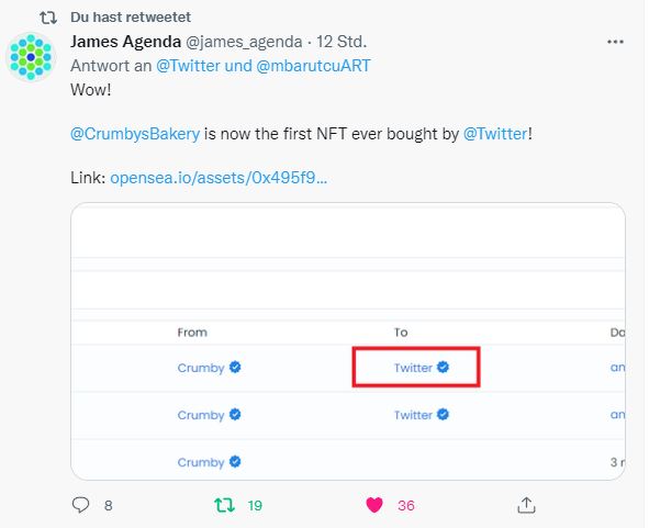Der Kurznachrichtendienst Twitter kaufte sein allererstes NFT und das ausgerechnet von Crumbys Bakery. Dementsprechend stolz zeigte sich Memo Barutcu, als die Nachricht bestätigt war und sich auf Twitter verbreitete.