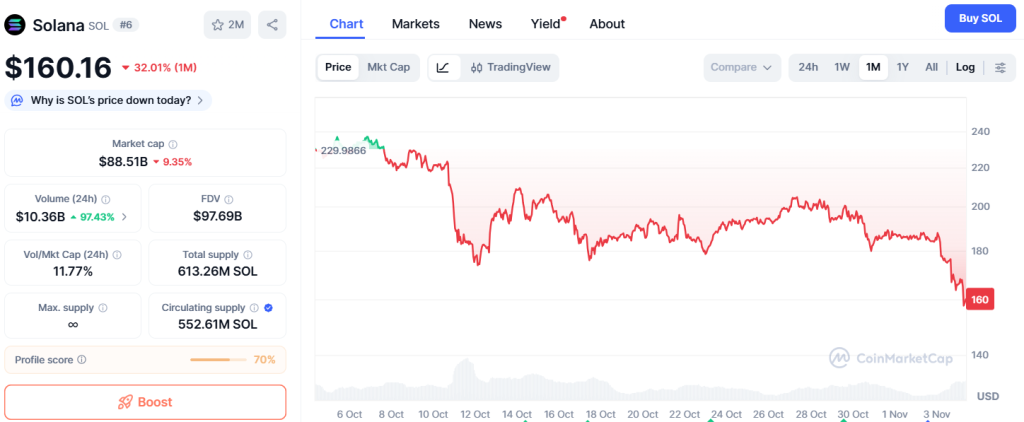 Solana hat seit gestern 8,78% an Wert verloren, im Wochenvergleich sind es sogar 21,25%. Mit einem Kurs von $160 ist das Monatshoch von $236,80 meilenweit entfernt. Solana hat in nur einem Monat mit 32% fast ein Drittel seines Werts eingebüßt.