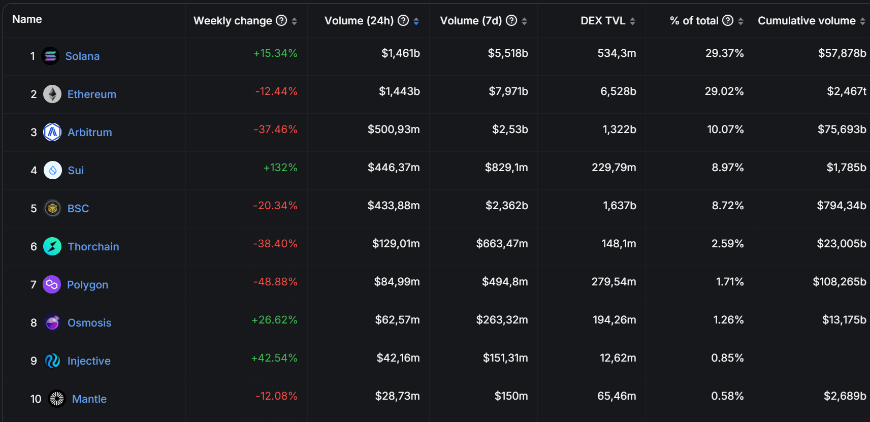 Ebenfalls auffällig: Das Handelsvolumen SUI legte im Wochenvergleich um stolze 132 Prozent zu. Zuletzt erreichte SUI auch beim Total Value Locked (TVL) erstmals die Top 10.