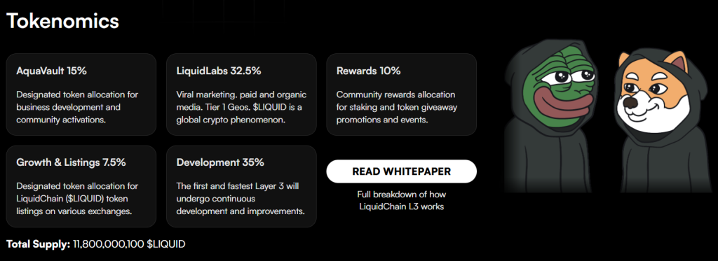 Das Gesamtangebot beträgt 11.800.000.100 $LIQUID-Token. 35 % sind für die Entwicklung vorgesehen, um die kontinuierliche Arbeit am Layer-3-Netzwerk, der Sicherheit und den Infrastruktur-Upgrades sicherzustellen. 32,5 % sind LiquidLabs zugewiesen, das sich auf Marketing, Bekanntheitsgrad und das Wachstum des Ökosystems in wichtigen Regionen konzentriert.