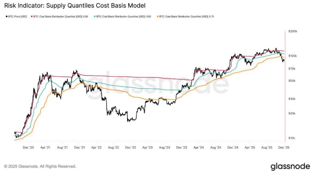 Mehr als 25 % des BTC-Angebots sind jetzt im Minus, da der Preis unter das wichtige 0,75-Quantil-Kostenbasisband gefallen ist. Dies ist derselbe Durchbruch, der früher den Beginn tieferer Bären-Zyklen markiert hat.