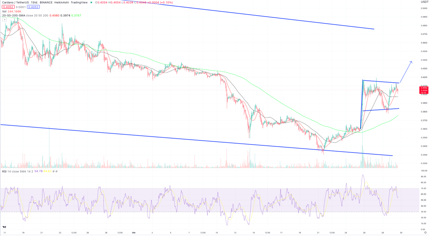 Kurzfristig sieht es im Stunden-Chart bei ADA positiver aus. In den vergangenen Tagen bildete sich eine Bull-Flag, die einen Ausbruch nach oben indiziert. Zugleich bildeten SMA 20 und SMA 50 ein bullisches Cross-Over. Auch dieses Golden Cross deutet aktuell auf einen Ausbruch bei ADA aus der Bullen-Flagge hin. Diese dürfte jedoch noch im Rahmen der in der höheren Zeiteinheit relevanten Range erfolgen. Dem steht auch der Relative Strength Indicator nicht entgegen. Erst kürzlich schoss dieser im 1-Stunden-Chart in den leicht überkauften Zustand, kühlte sich durch die Konsolidierung innerhalb des charttechnischen Musters der Bullenflagge jedoch wieder ab.