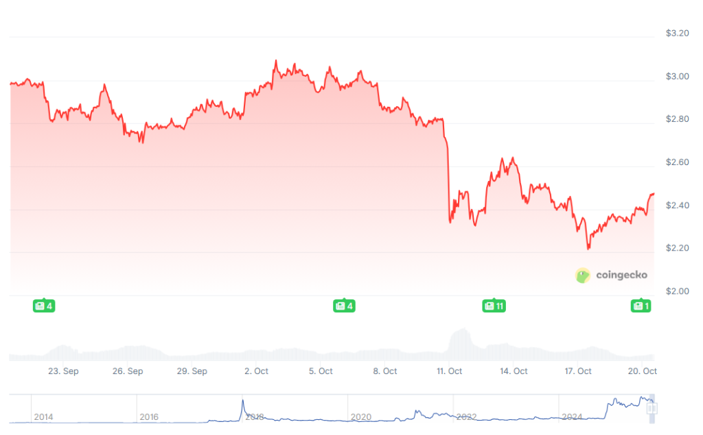 Die vergangenen Wochen waren für XRP-Anleger alles andere als leicht. Am 10. Oktober kam es zu einem scharfen Einbruch, der sich nur wenige Tage später nahezu identisch wiederholte. Verunsicherung machte sich breit, der Kurs fiel zwischenzeitlich deutlich unter die Marke von 2,30 US-Dollar. Seit dem gestrigen Tief scheint sich nun eine erste Stabilisierung anzubahnen. Mit aktuell 2,47 US-Dollar notiert der Coin wieder deutlich stärker – eine mögliche Trendwende? Oder nur die Ruhe vor dem nächsten Rücksetzer?