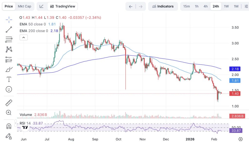 Ein Blick auf den Tageschart offenbart eine klare Abwärtstendenz. XRP notiert aktuell im Bereich von rund 1,40 US-Dollar und damit signifikant unter den gleitenden Durchschnitten. Sowohl der EMA 50 bei etwa 1,81 US-Dollar als auch der EMA 200 im Bereich von 2,18 US-Dollar verlaufen klar über dem aktuellen Kurs. Solange XRP diese Zonen nicht zurückerobert, bleibt das charttechnische Bild angeschlagen.