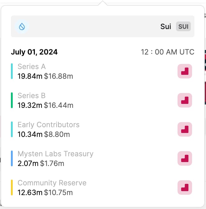 Detalle a detalle, el 1 de julio, el protocolo liberó 64,20 millones de SUI para los inversores privados, el equipo de desarrollo y la tesorería de Mysten Labs. Esencialmente, los inversores privados recibirán 39,16 millones de SUI, lo que representa más del 60% del valor total de 54,63 millones de dólares a liberar.