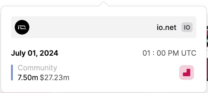 Para concluir con el top 3 de criptomonedas que debes evitar, el último desbloqueo es el de io.net (IO). Con base a los datos recaudados, anuncia una liberación comunitaria de 7,5 millones de tokens por valor de 27,23 millones de dólares y una inflación de la oferta de casi el 8%.
