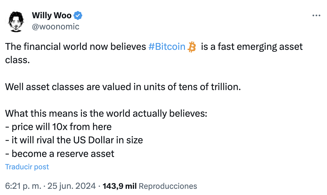 Según compartió en redes sociales, Woo proyecta que el Bitcoin podría fácilmente llegar a rivalizar con el dólar estadounidense. Esto desencadenaría posteriormente su designación como un activo de reserva a escala global. Si, según afirma, establecemos como correcta una tasa de adopción entre el 25-40%, el apogeo de Bitcoin llegaríamos a verlo en el año 2030. Entre otras cosas, en este proceso tendríamos a un BTC que multiplicaría x10 su actual valor.